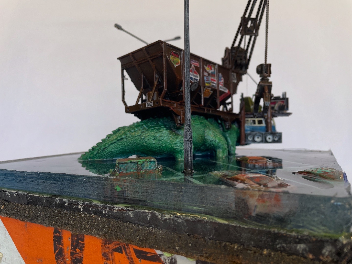 The Gatorverse is a long-term, multi-platform project that merges sculpture, video, installation, and broadcasting to explore the themes of environmental collapse and the consequences of consumerism. It is a speculative world where a dystopian future, born from human consumption, has led to a new evolutionary path: the fusion of machine and reptile.- GATORVERSE NEWSREELS
